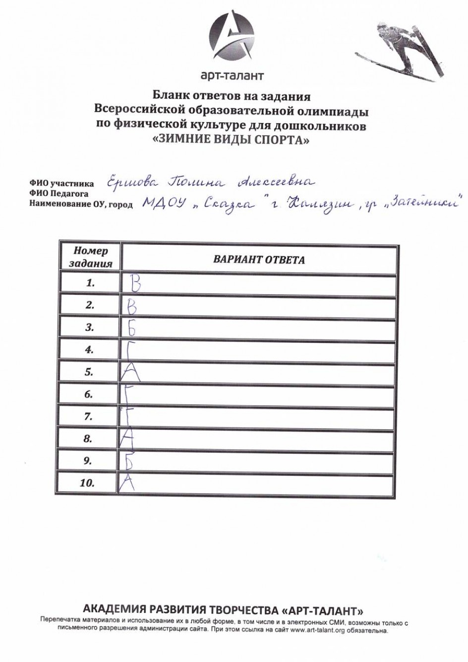 Ершова Полина Алексеевна, МДОУ "Сказка", г. Калязин, гр. "Затейники"
