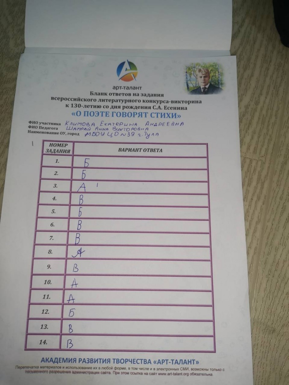 Климова Екатерина Андреевна, МБОУ ЦО 39 г Тула