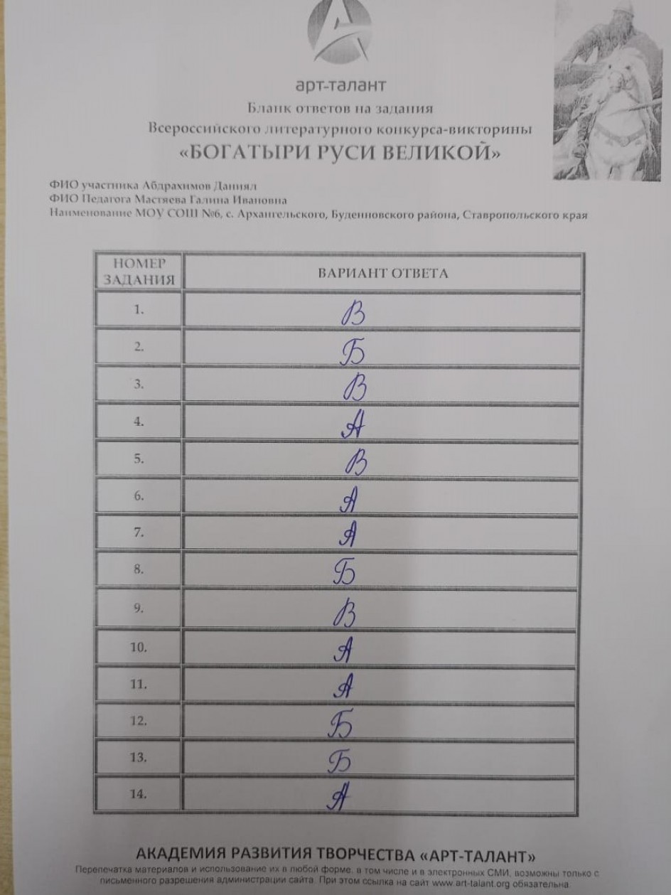 Абдрахимов Даниял, МОУ СОШ №6 с. Архангельского
