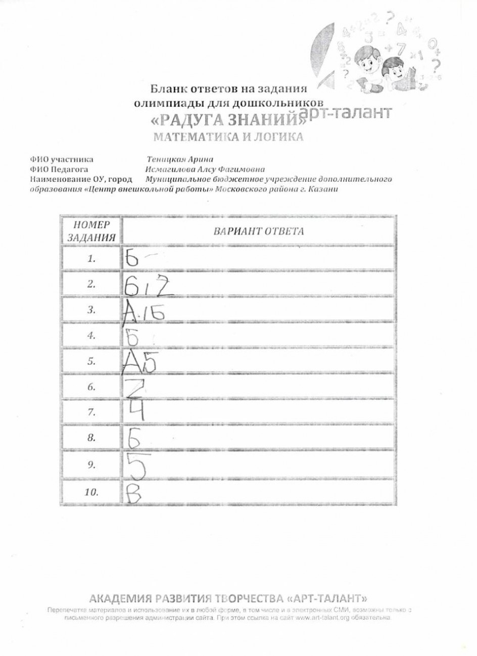 Теницкая Арина Ивановна, Муниципальное бюджетное учреждение дополнительного образования "Центр внешкольной работы" Московского района г. Казани
