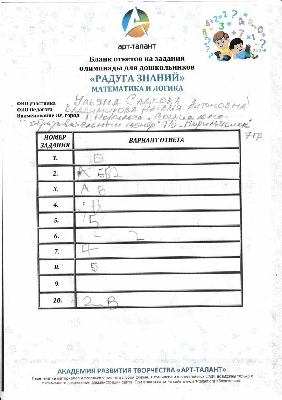 Садкова Ульяна, "Социально-образовательный центр" г.Норильск, т/о "Норильчонок", 7 группа