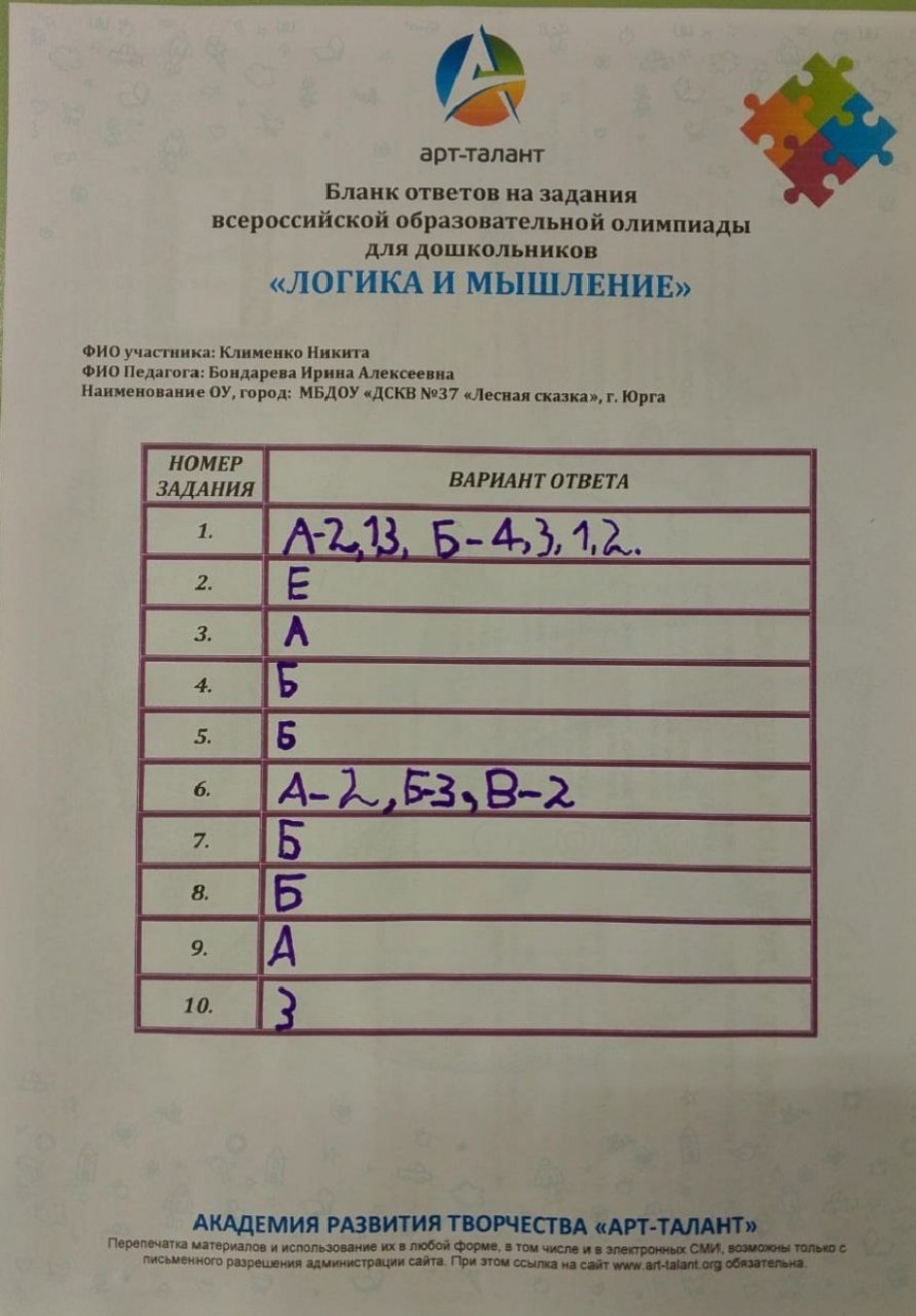 Клименко Никита, МБДОУ " ДСКВ № 37 "Лесная сказка"