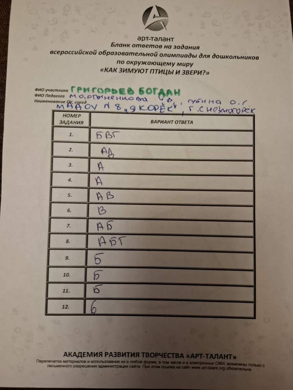Григорьев Богдан, МАДОУ №8 «Якорёк». г. Снежногорск