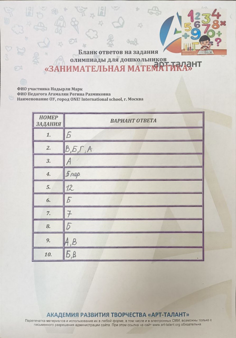 Надырли Марк, ONE! International School, г. Москва