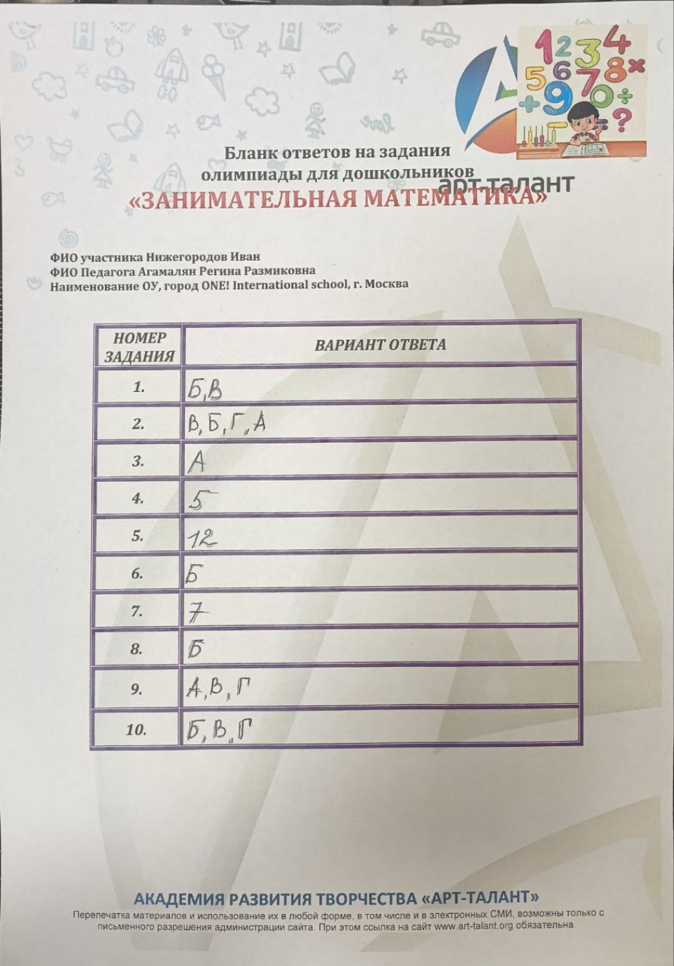 Нижегородов Иван, ONE! International School, г. Москва