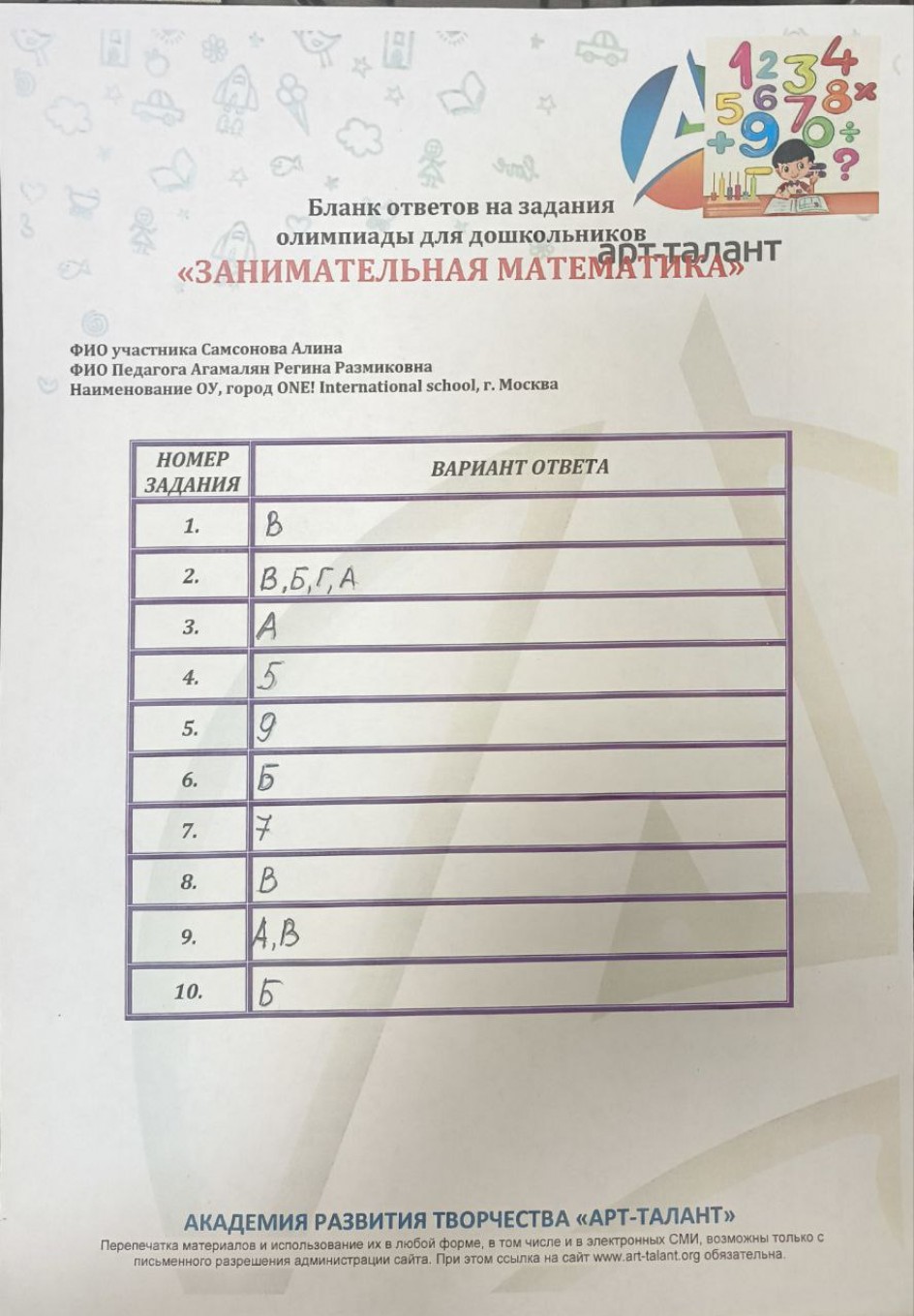 Самсонова Алина, ONE! International School, г. Москва