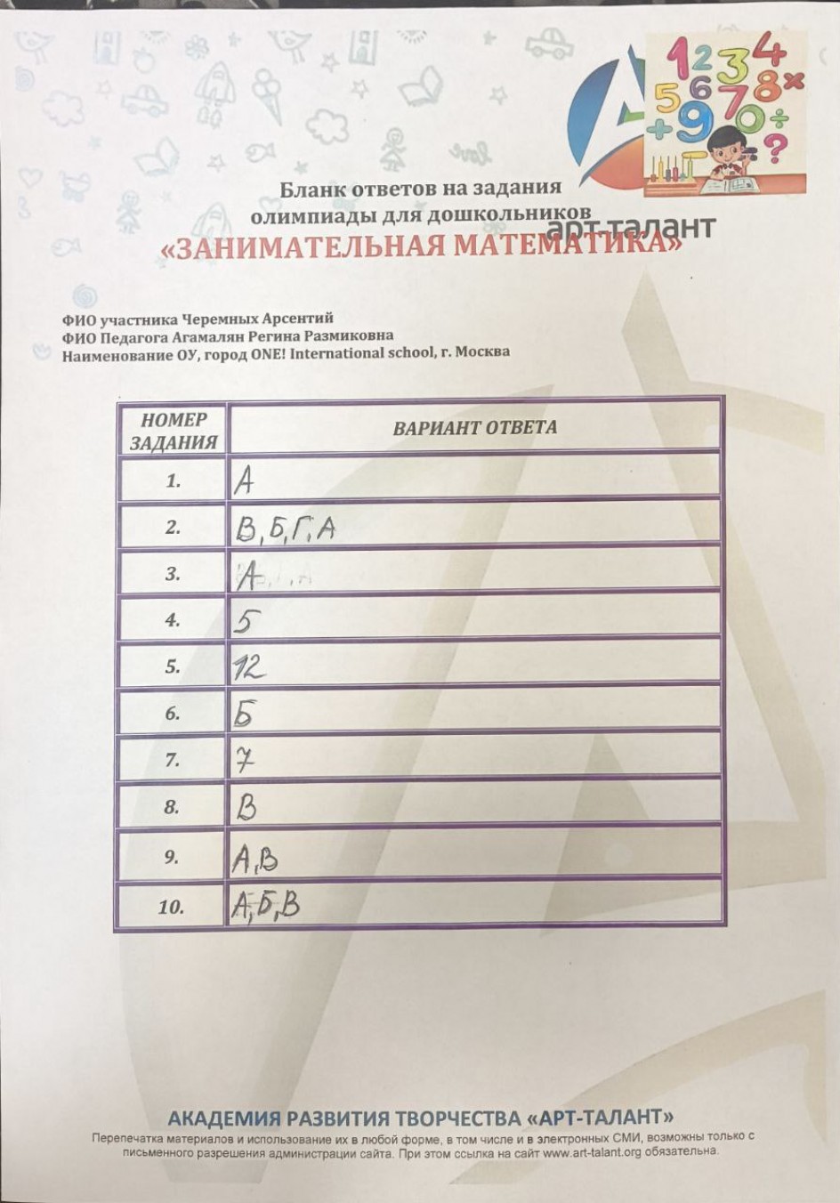 Черемных Арсентий, ONE! International School, г. Москва