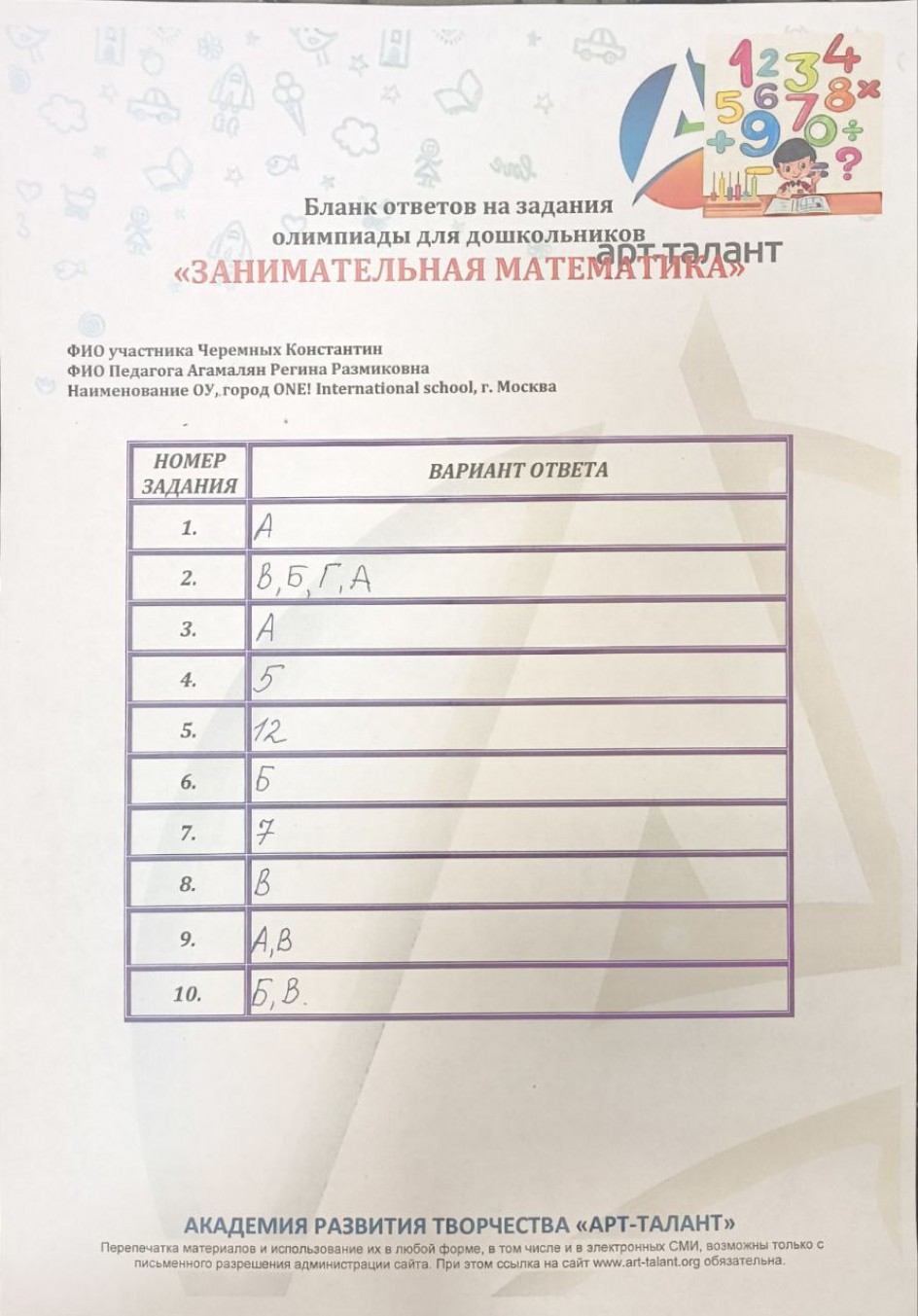 Черемных Константин, ONE! International School, г. Москва