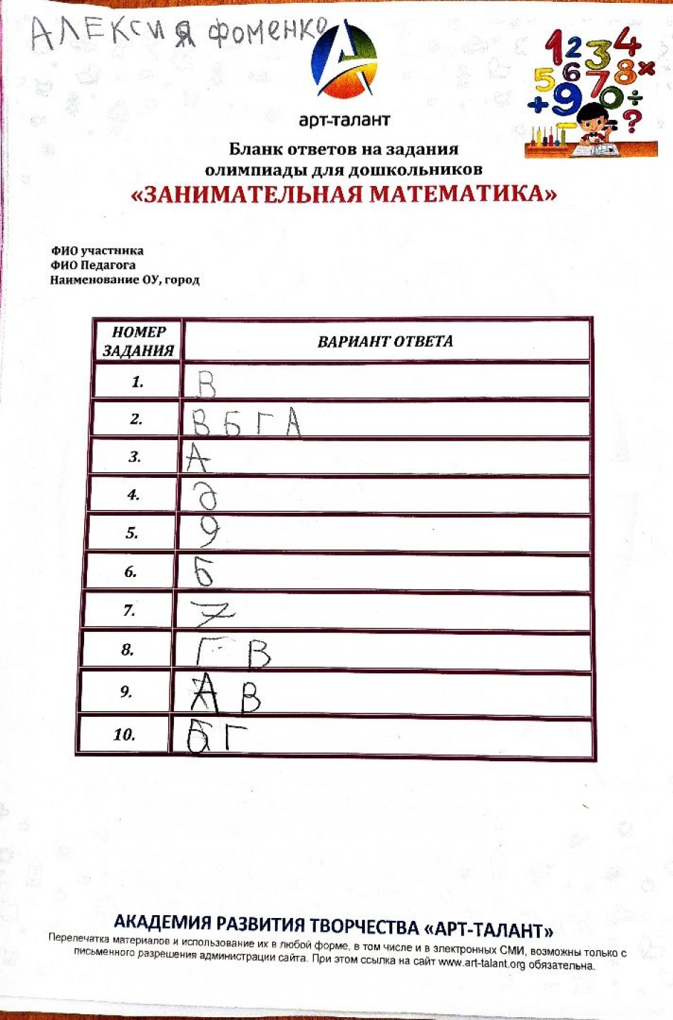 Фоменко Алексия, ONE! International school