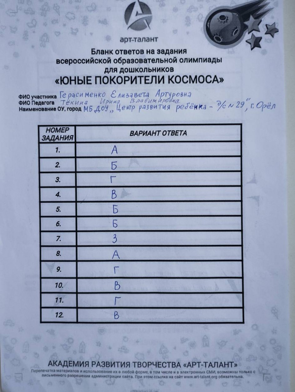 Герасименко Елизавета Артуровна, МБ ДОУ "Центр развития ребенка - детский сад 29" г. Орёл
