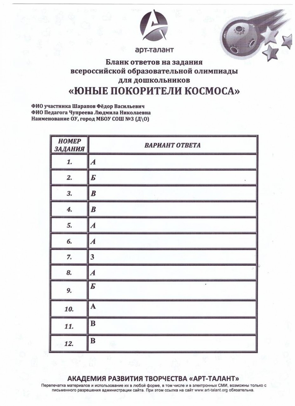 Шарапов Фёдор Васильевич, МБОУ СОШ №3 (д\о) Одинцово