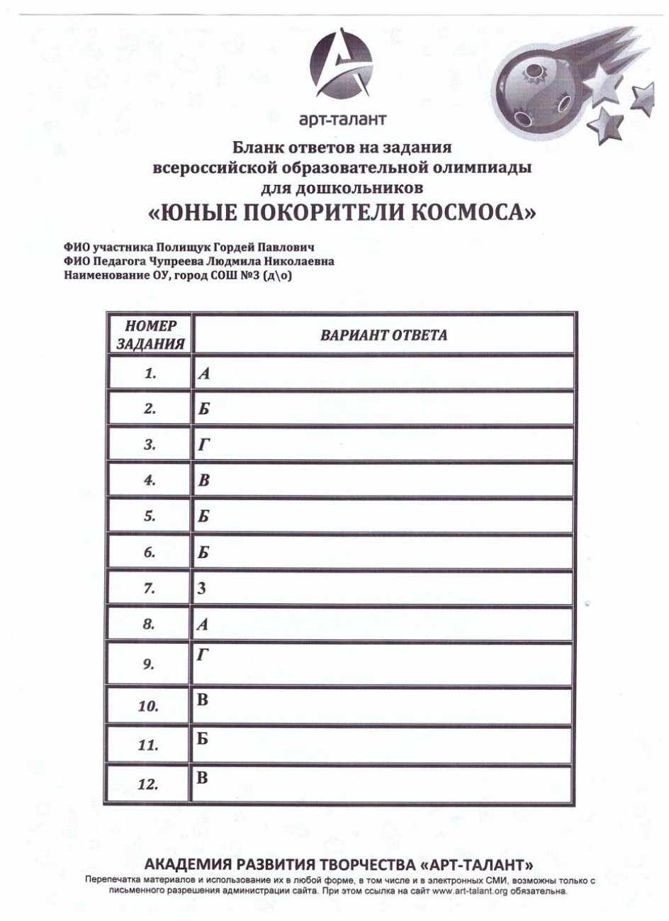 Полищук Гордей Павлович, МБОУ СОШ №3 (д\о) Одинцово