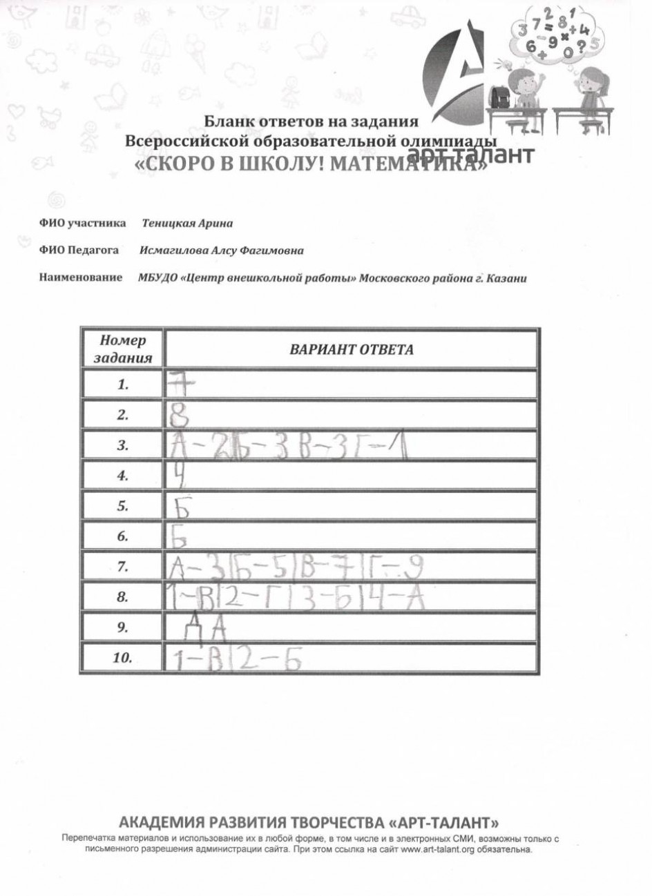 Теницкая Арина, Муниципальное бюджетное учреждение дополнительного образования "Центр внешкольной работы" Московского района г. Казани