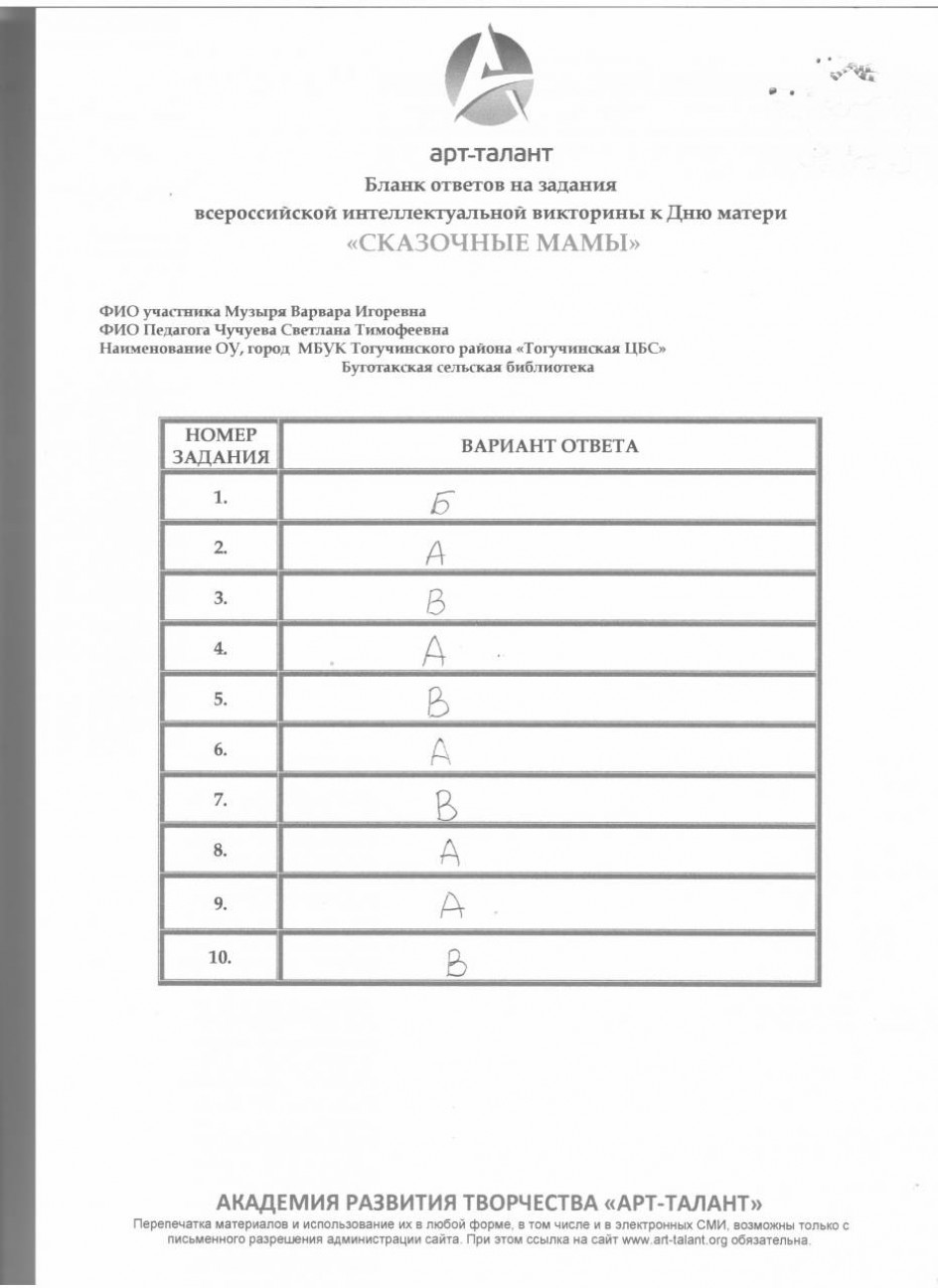 Музыря Варвара Игоревна, МБУК "Тогучинская ЦБС" Буготакская сельская библиотека