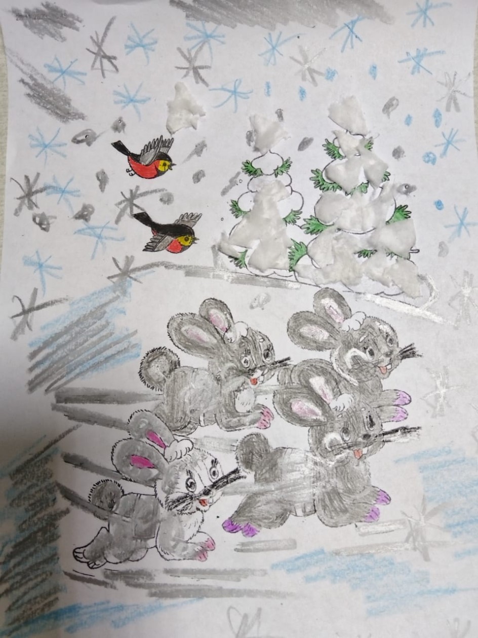Работа выполнена карандашами, зайчики получились весёлыми, быстрыми. Снег из ваты и звездочки делают работу правдивой и оригинальной.