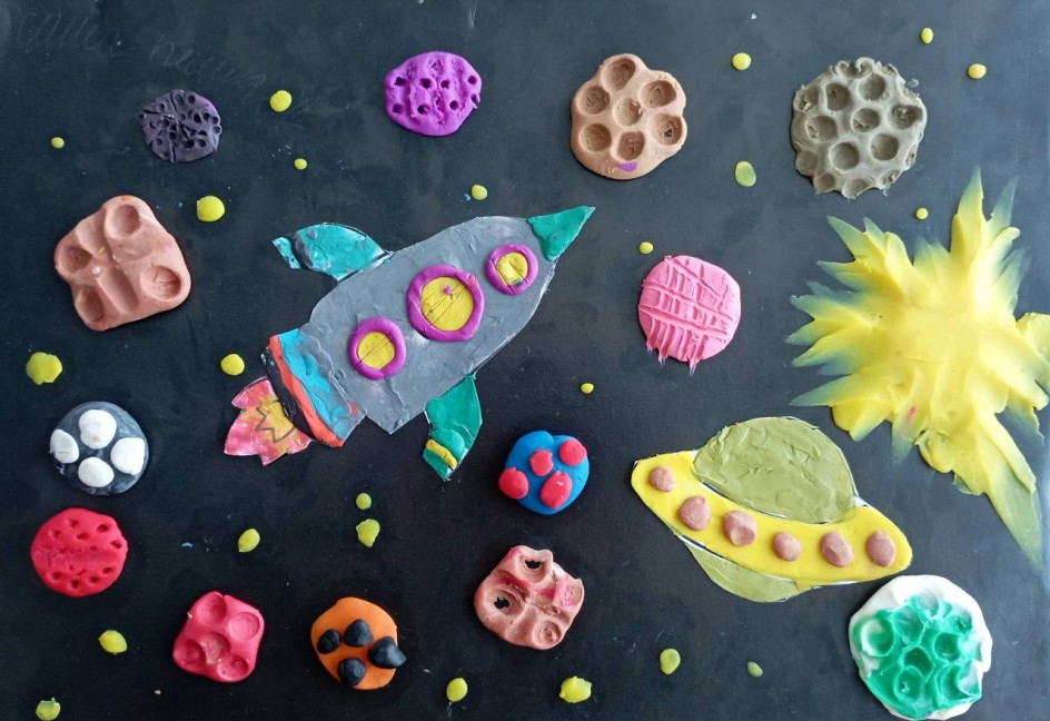 Я изобразил космическое пространство из пластилина. Солнце и различные планеты, даже неведомые, а ещё космический корабль