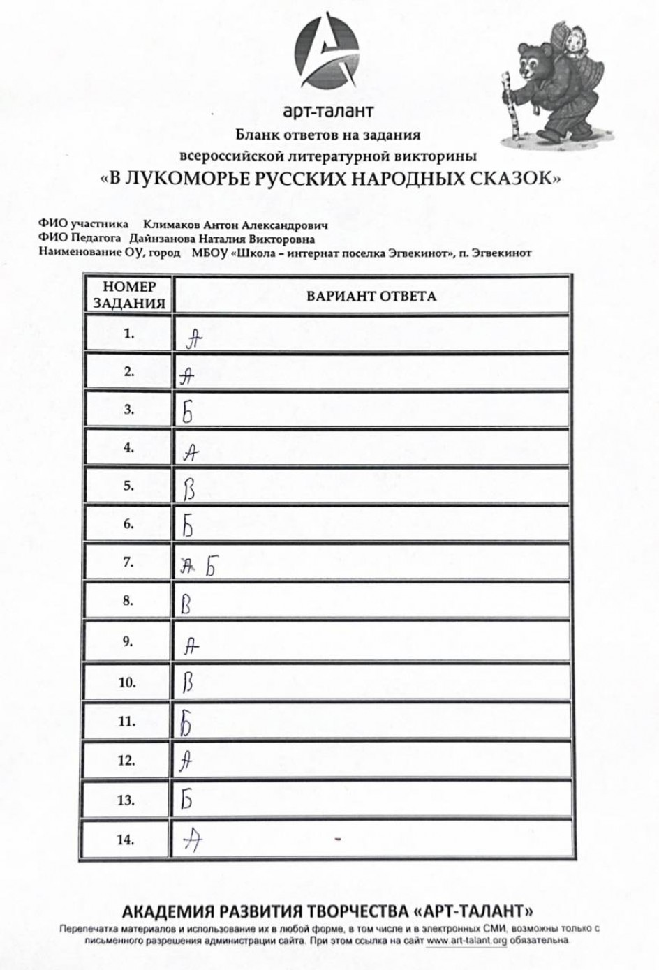 Климаков Антон Александрович, МБОУ «Школа-интернат п. Эгвекинот»