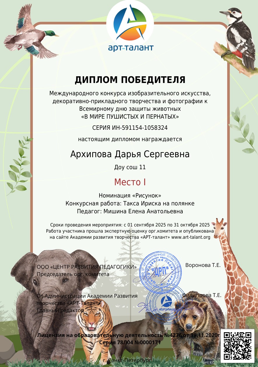 Международный конкурс изобразительного искусства, декоративно-прикладного творчества и фотографии к Всемирному дню защиты животных «В МИРЕ ПУШИСТЫХ И ПЕРНАТЫХ»