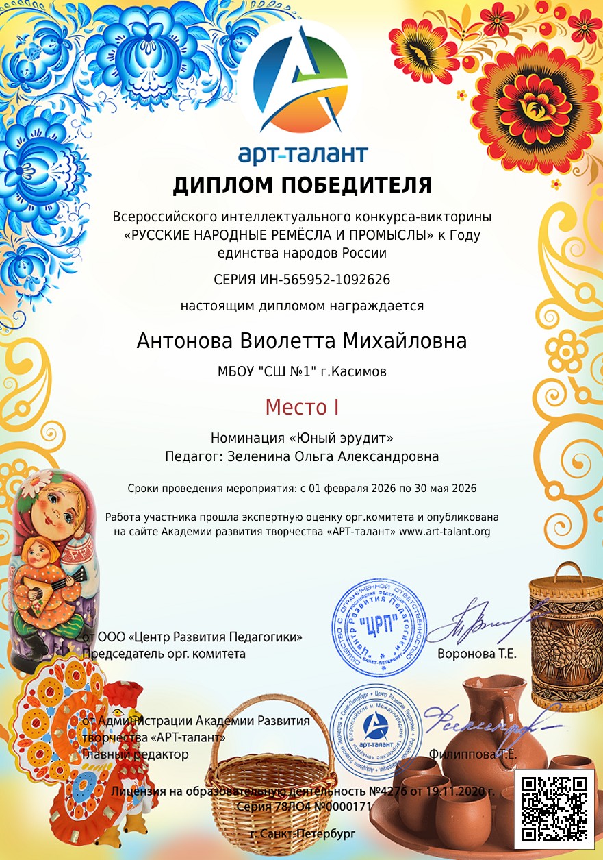 Всероссийский интеллектуальный конкурс-викторина «РУССКИЕ НАРОДНЫЕ РЕМЁСЛА И ПРОМЫСЛЫ» к Году единства народов России