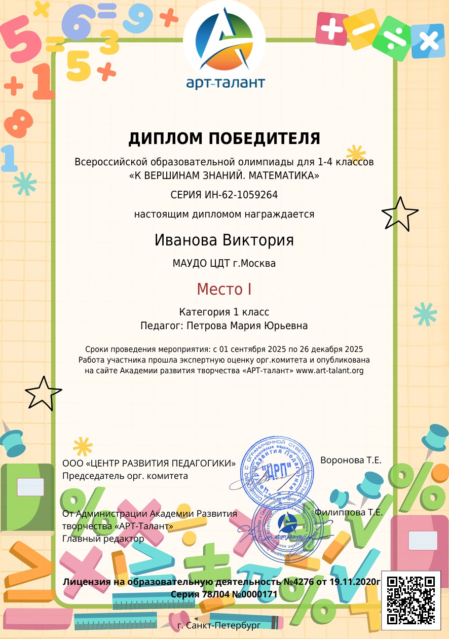 Олимпиада по математике проводится для учащихся 1-4 классов. Участники, педагоги и родители получают награды сразу после приема заявки.