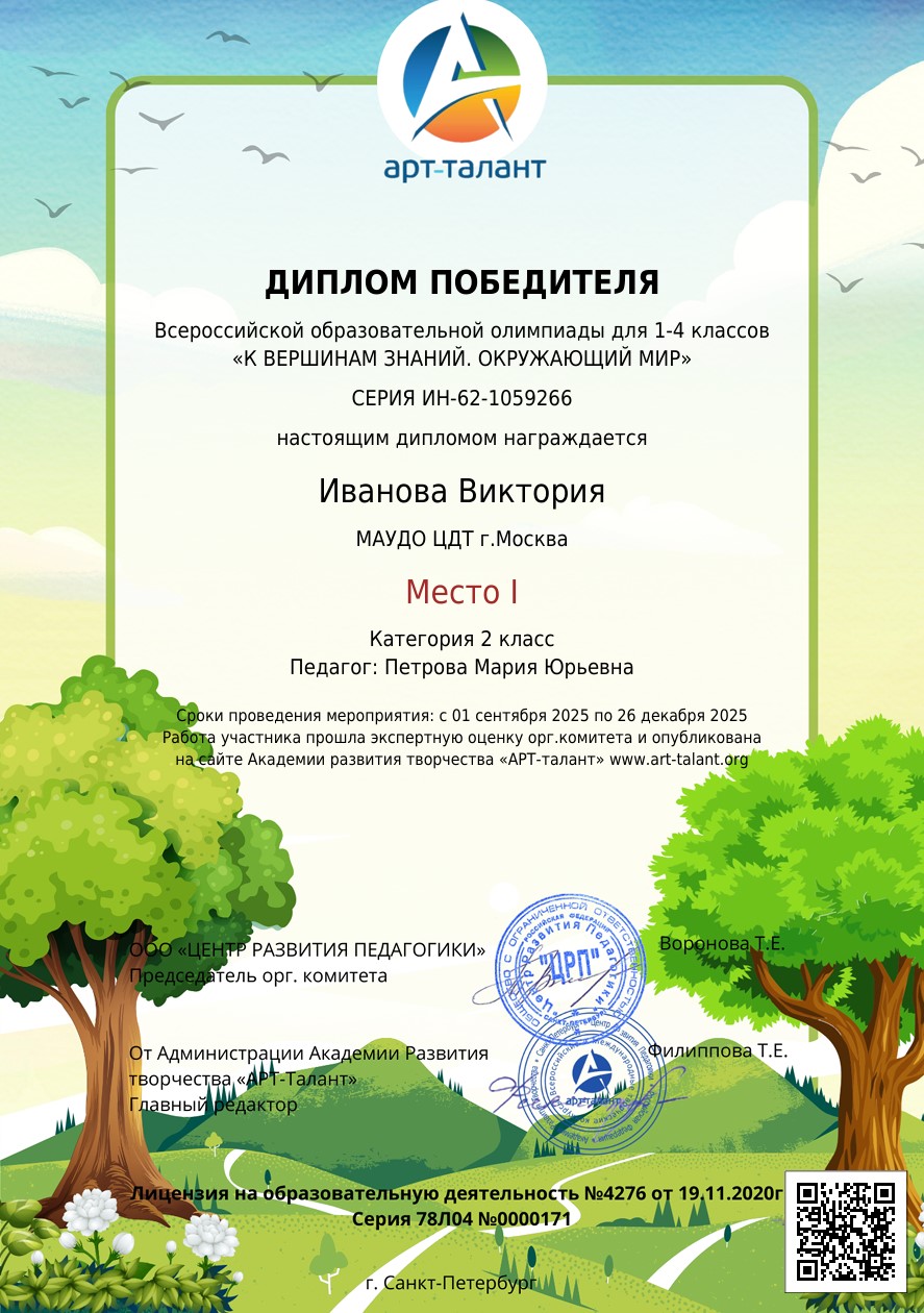 Олимпиада по окружающему миру проводится для учащихся 1-4 классов. Участники, педагоги и родители получают награды сразу после приема заявки.