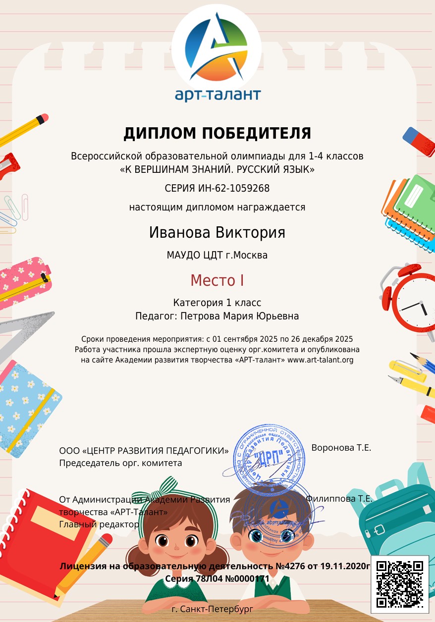 Олимпиада по русскому языку проводится для учащихся 1-4 классов. Участники, педагоги и родители получают награды сразу после приема заявки.