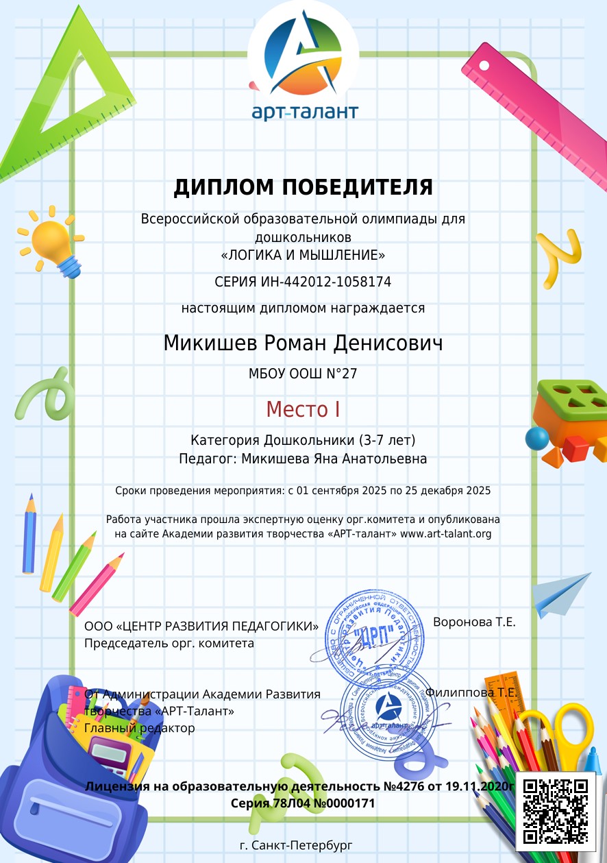 Олимпиада по логике проводится для детей от 5 до 7 лет. Участники, педагоги и родители получают награды сразу после приема заявки.