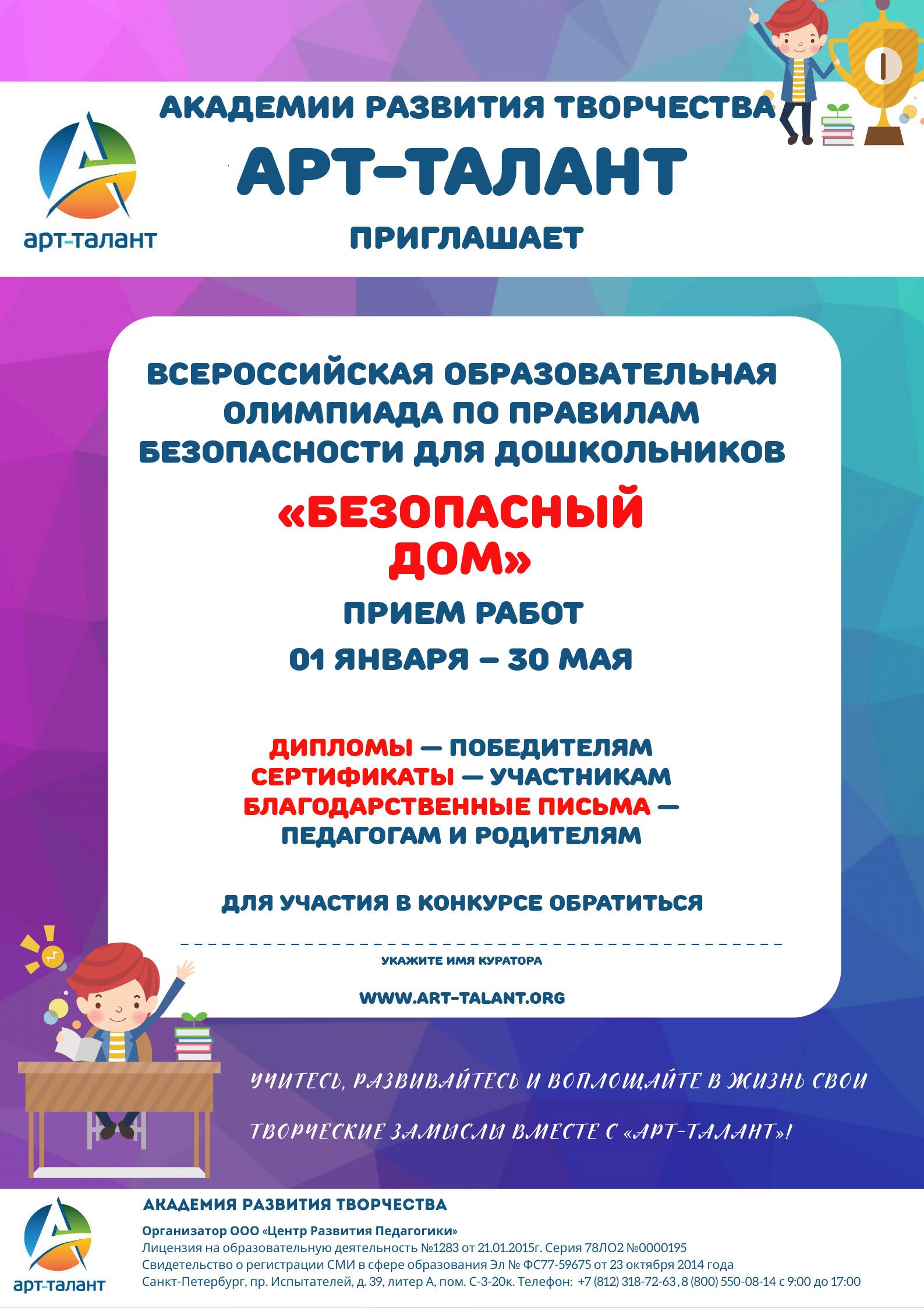 Организатором конкурса является ООО «ЦЕНТР РАЗВИТИЯ ПЕДАГОГИКИ». Площадкой для проведения Конкурса является образовательный портал Академии развития творчества «АРТ-Талант».