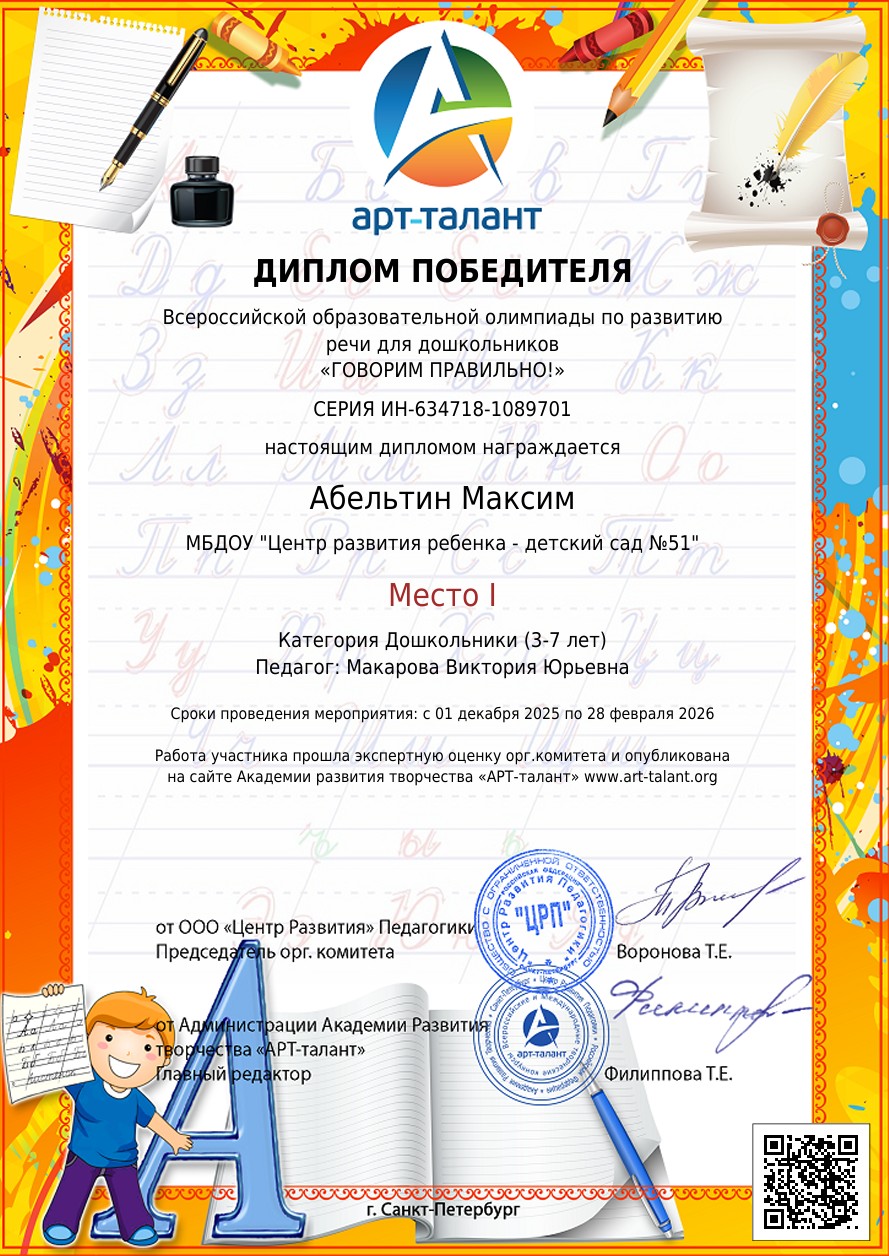 Олимпиада по развитию речи проводится для детей от 5 до 7 лет. Участники, педагоги и родители получают награды сразу после приема заявки.