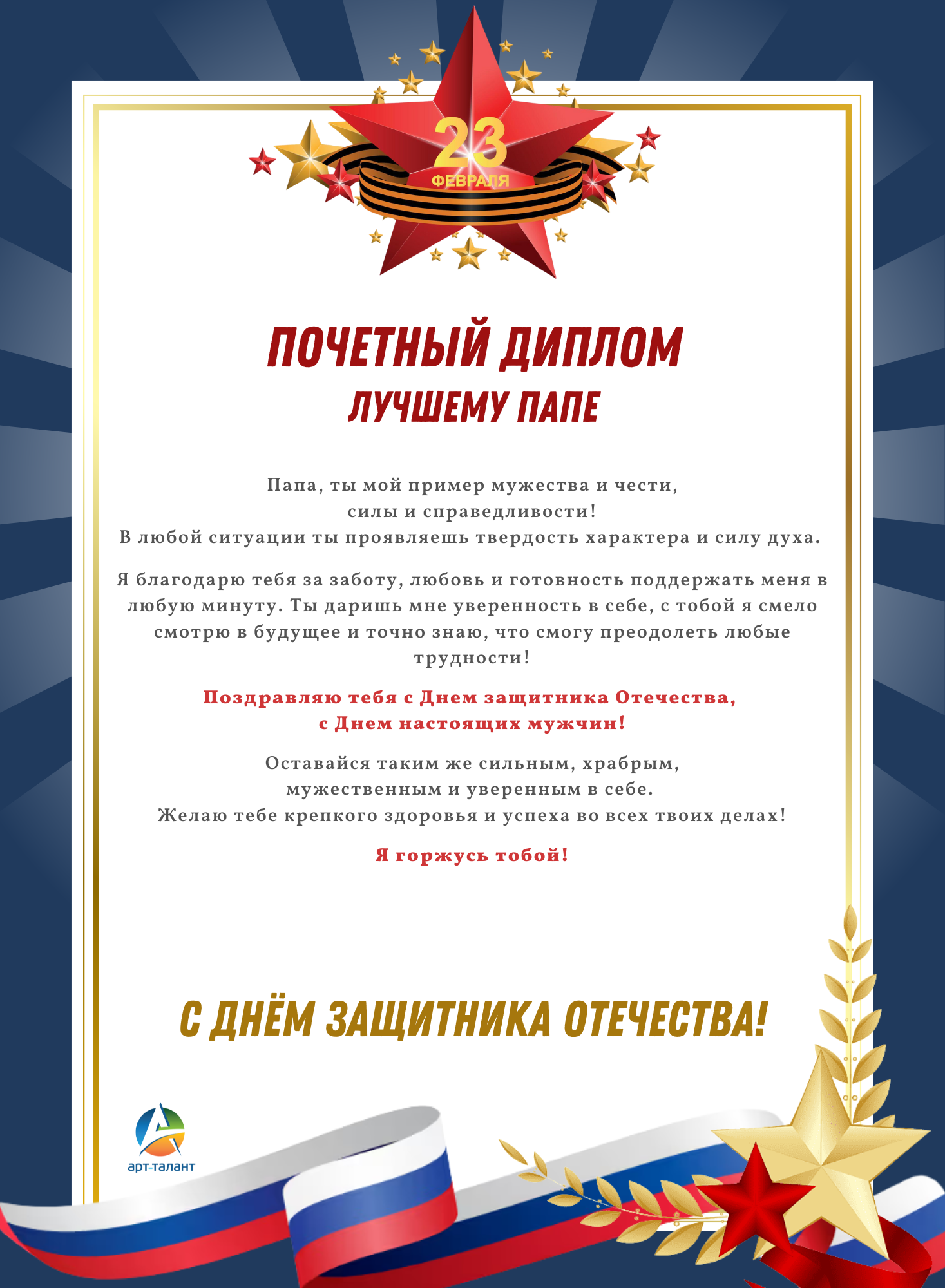 Всем участникам конкурса, посвященных празднику 23 февраля, мы дарим ПОЧЕТНЫЙ ДИПЛОМ с поздравлениями для папы.