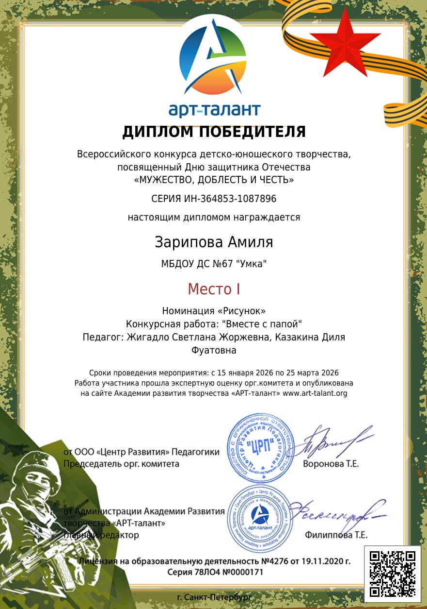 Для получения поздравительного диплома необходимо принять участие в одном из конкурсов детского творчества или викторине, посвященных празднику 23 февраля. После принятия заявки и публикации конкурсной работы на сайте Вы сможете скачать грамоту в Личном кабинете в разделе ДОПОЛНИТЕЛЬНЫЕ ДОКУМЕНТЫ.
