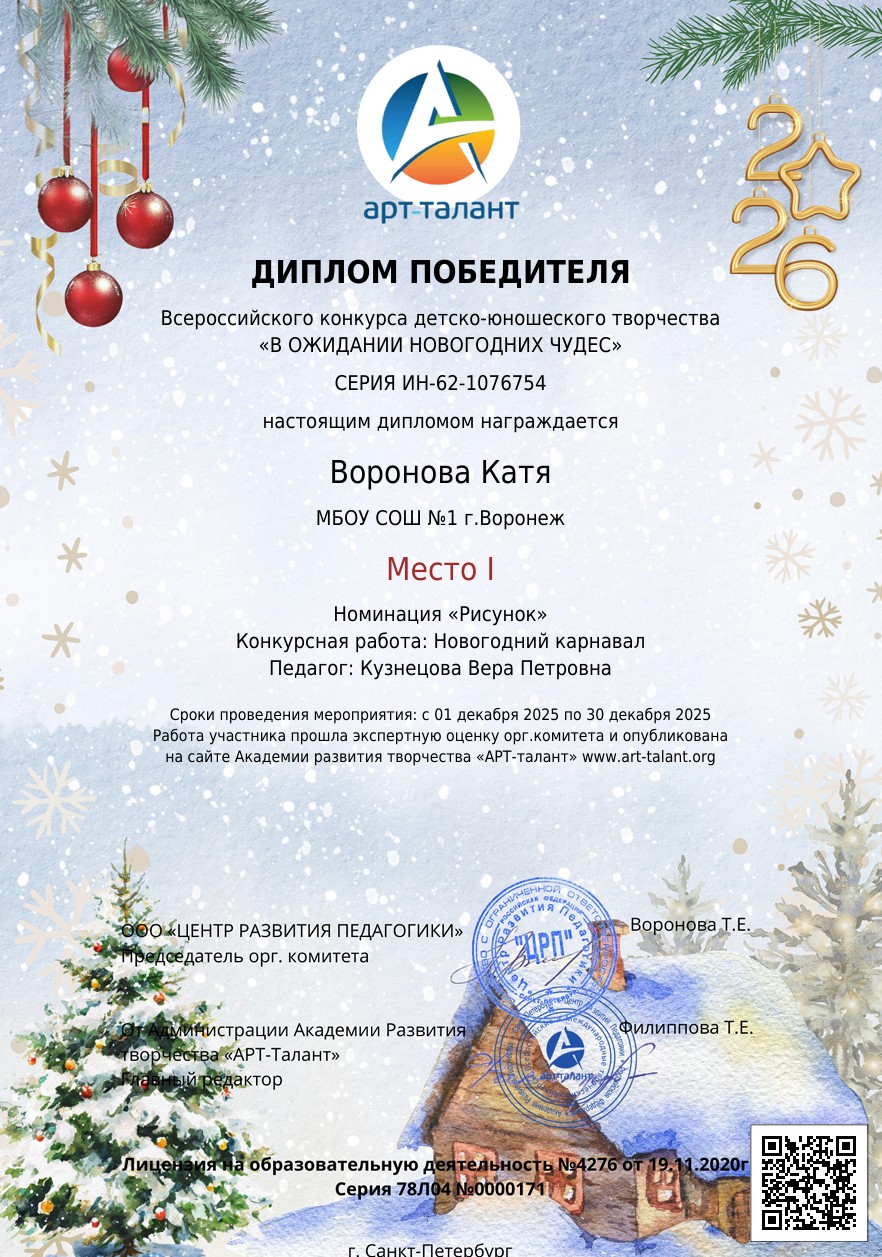 Для получения поздравительной грамоты необходимо принять участие в одном из зимних конкурсов детского творчества или викторине, посвященной зиме. После принятия заявки и публикации конкурсной работы на сайте Вы сможете скачать грамоту в Личном кабинете в разделе ДОПОЛНИТЕЛЬНЫЕ ДОКУМЕНТЫ.