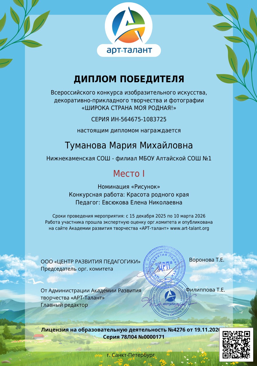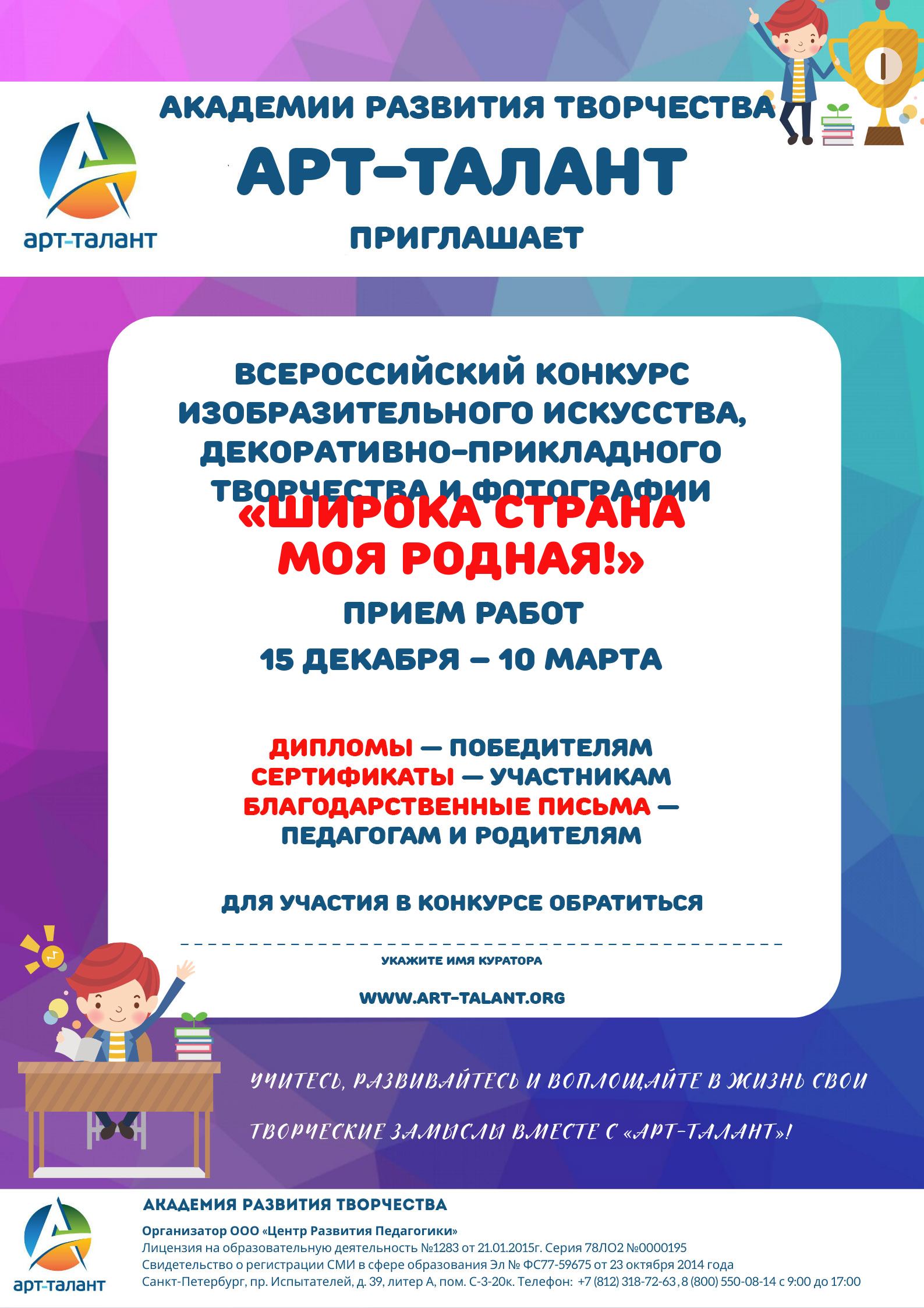 Всероссийский конкурс изобразительного искусства, декоративно-прикладного творчества и фотографии «ШИРОКА СТРАНА МОЯ РОДНАЯ!»