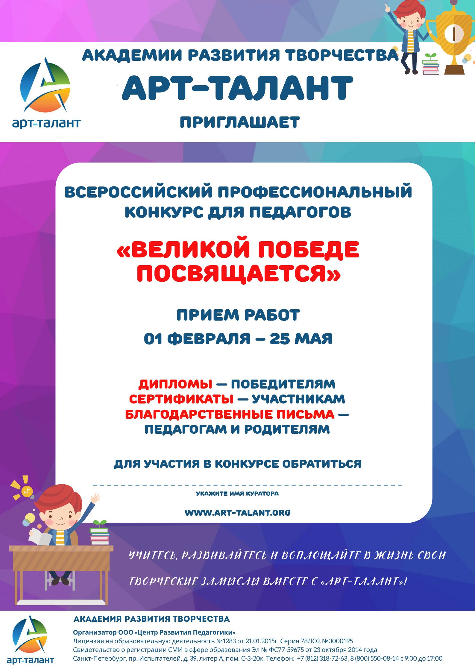 Конкурс проводится с ускоренным подведением итогов: итоги конкурса будут подводится каждый понедельник в течение срока приема работ. Дипломы будут доступны для скачивания в личном кабинете.