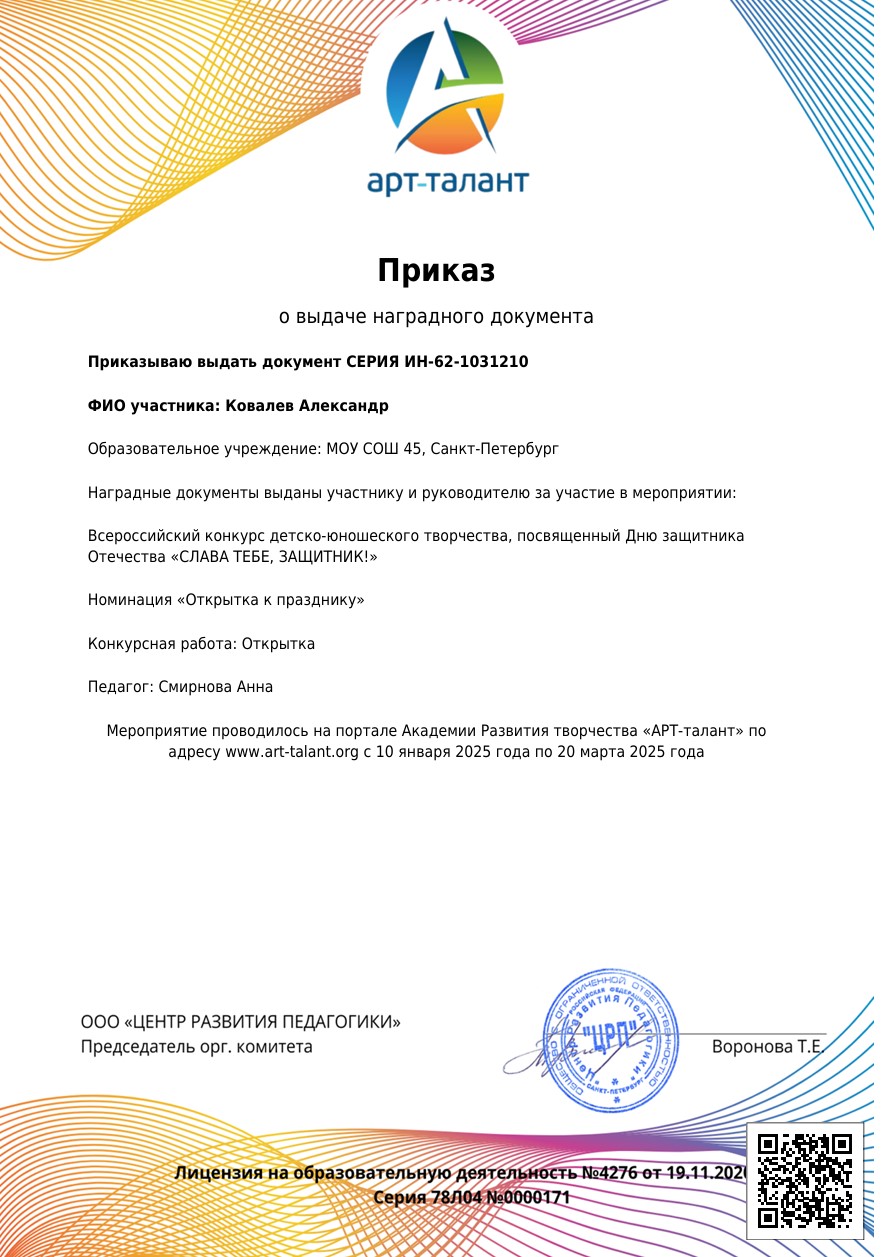 - ПЕДАГОГУ- диплом педагога, подготовившего участника